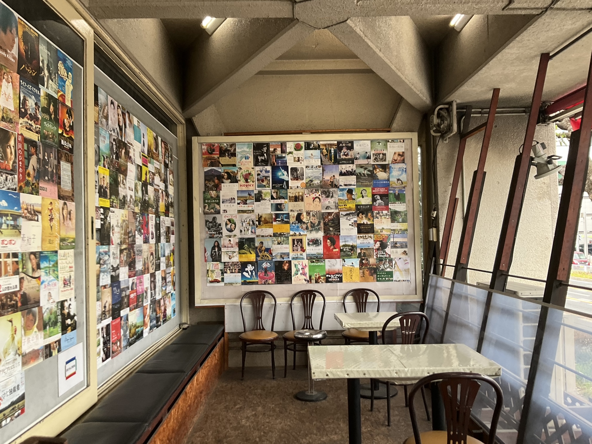 こちらは屋外ロビーの様子。今までに上映された作品のチラシが隙間無く貼られています。