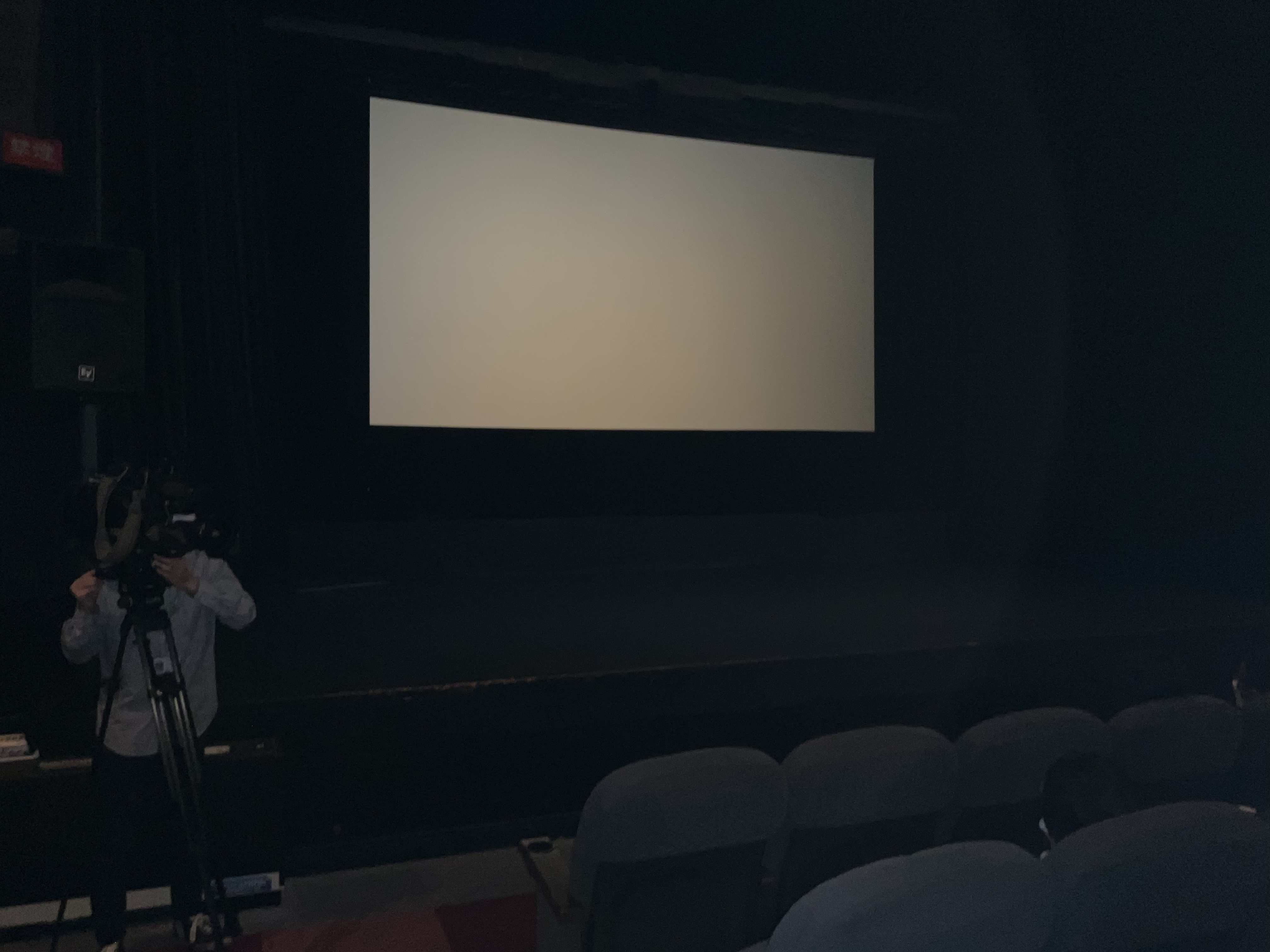 写真ではちょっと分かりにくいかもしれませんが今でも舞台は残っており、スクリーンは舞台奥の壁に設られています。なお写真の左側に映り込んでいるのはテレビカメラ。休館前の様子を取材に来ていたようです