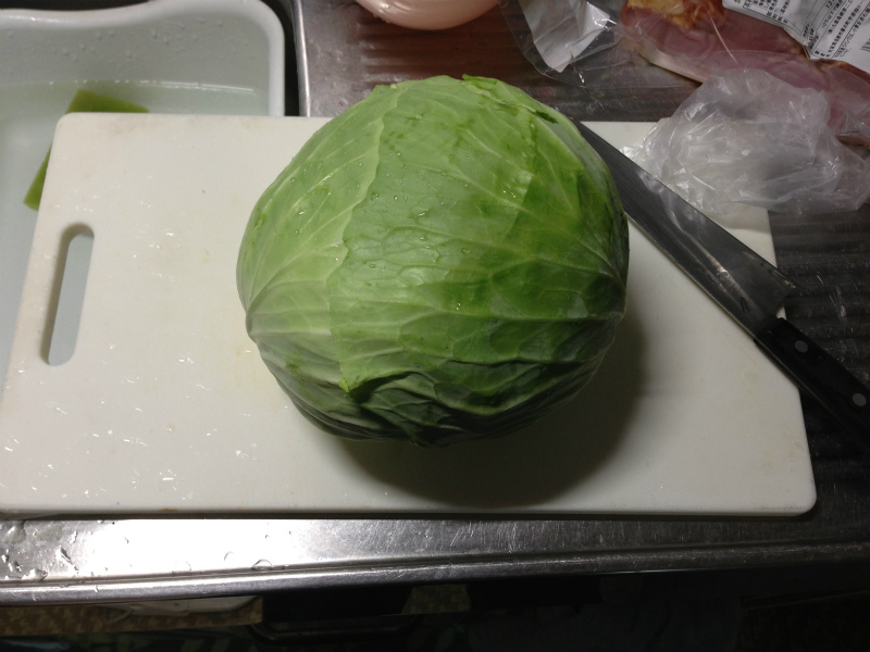 材料(4~5人前)はキャベツ1玉、ベーコンブロック1本、コンソメブロック2個、塩コショウ少々、以上!