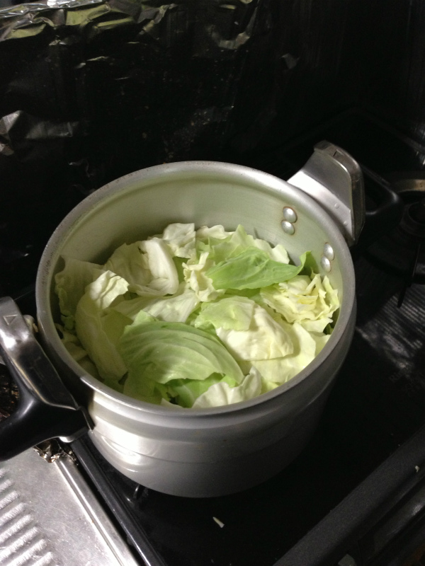 そして4っ等分したキャベツをなべの中へ。