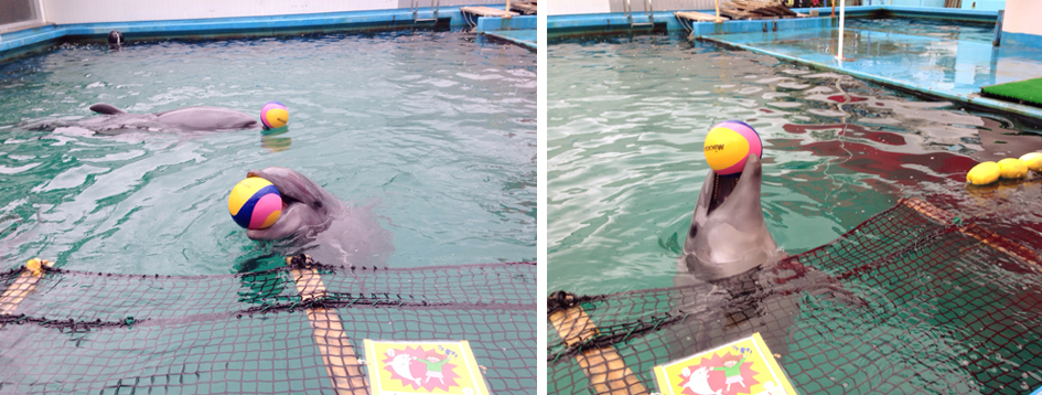 人が来ると、イルカさんがこっちにボールを投げてきますので、それを投げ返すと口で上手いことキャッチしてまた投げ返してくれます。