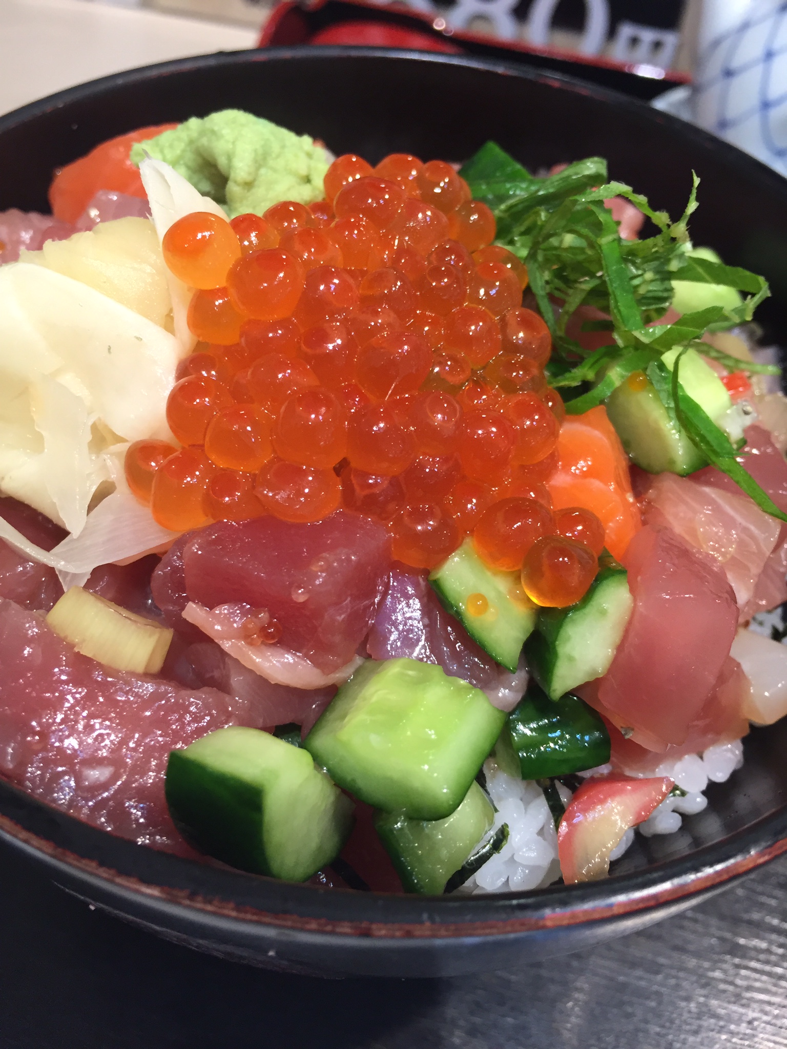 10種類の海鮮がごま油のタレをまとって、どんぶりご飯の上に乗っている海鮮丼です。
