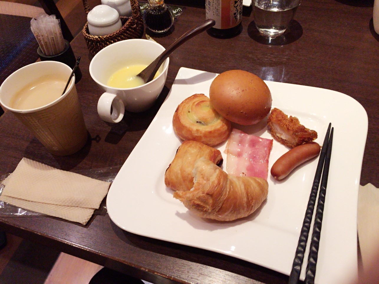 晩ご飯のネギつけラーメンとホテルのバイキングの朝食。