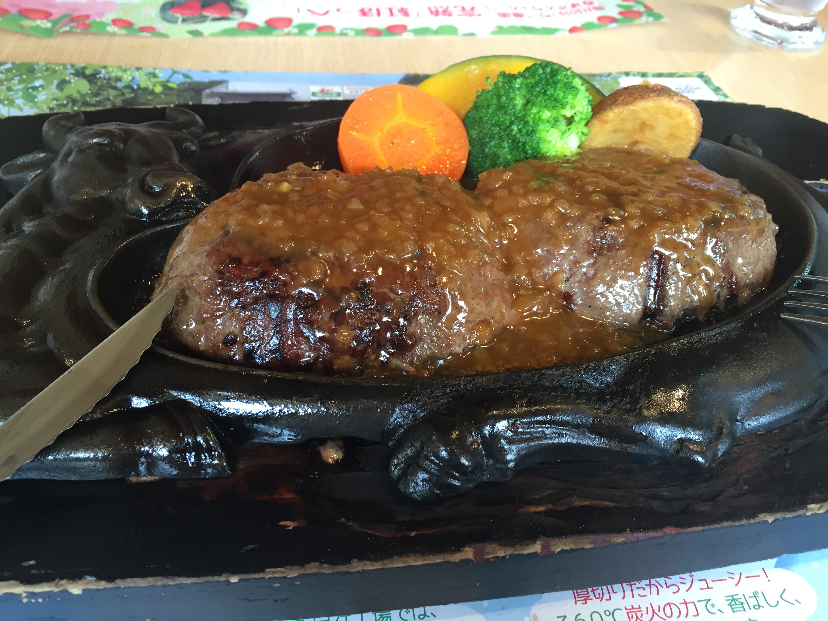 前回(1月のブログ参照)でも言いましたが、ここの「げんこつハンバーグ」は炭火で焼かれている外側と、テーブルで切り分けて焼かれる内側でちょうどいい焼け具合になり、肉汁が鉄板の上にあふれだすんです。