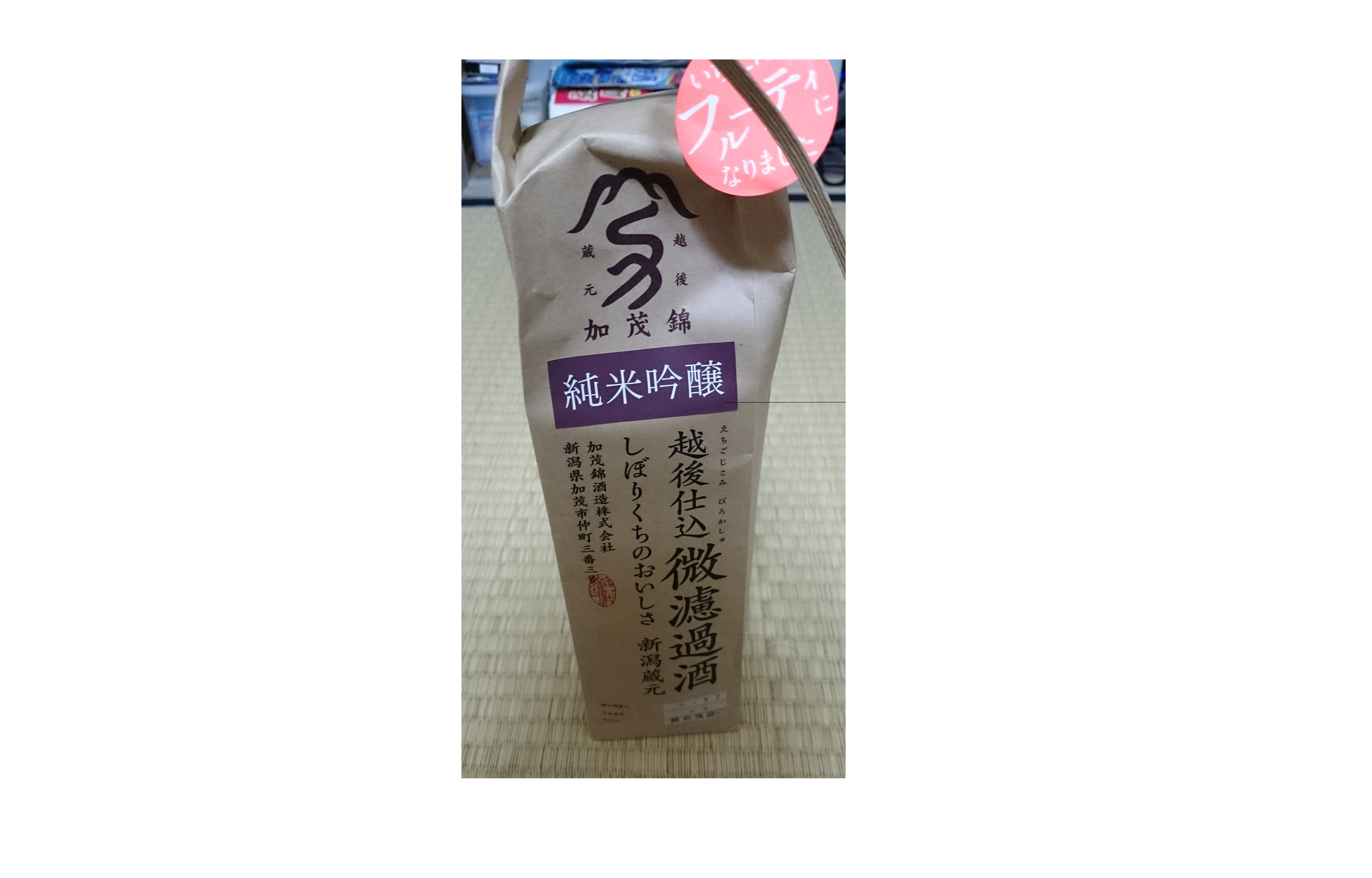 最後にじゃんけん大会では加茂錦を出品いたします。加茂錦は新潟県の中央より若干東寄りの加茂市の加茂山公園脇にある加茂錦酒造の酒です。米袋から作られた袋に入っていることがすごくユニークなこの酒は見た目だけで売る酒ではありません。これぞ吟醸といった強い吟醸香と純米吟醸酒だからこその味の強さ。人気の酒であることが納得の品です。