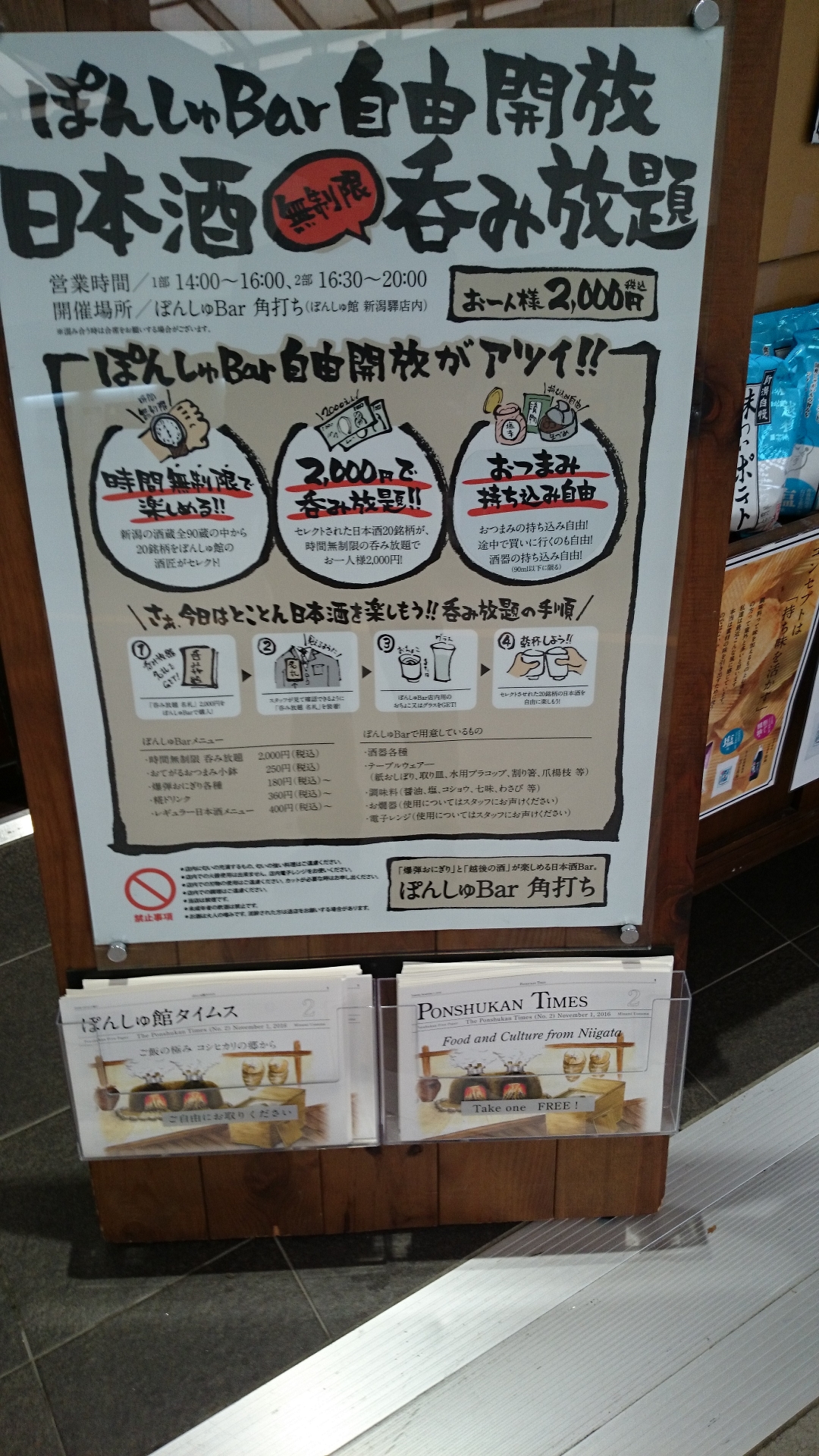 お店は以前、11月に新潟でイベントがあった際にも行ってきた新潟駅にあるぽんしゅ館です。新潟に行く際は一度訪れてみてください。2,000円で銘酒飲み放題という店があります。