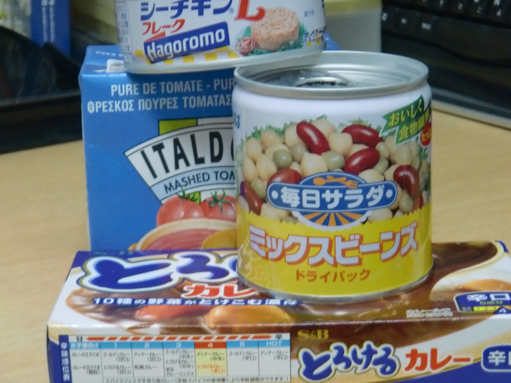 というわけで、今回の買出しのレシピは「4日間食べ続けられるカレー」。ひよこ豆を中心に、シーチキンとトマトでコクを出した、すごく本格派に見える手抜きカレーですよー。